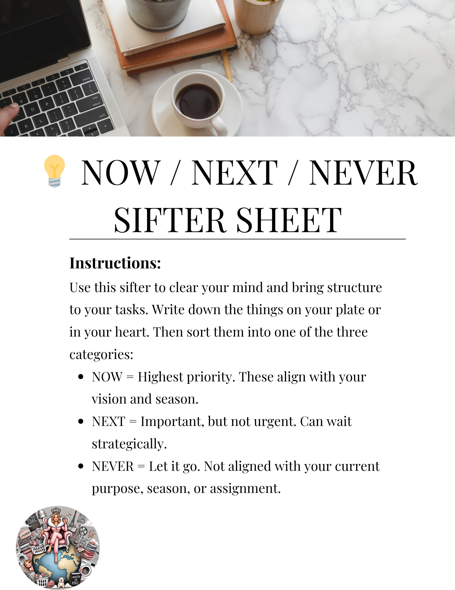 If your mind is full, your plate is overflowing, or you struggle to sort what truly matters from what’s just noise—this worksheet will change everything in minutes.