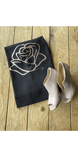 This beautiful black crew has a rose gold rose front and center on the front of the shirt. It proudly boasts cursive pink vinyl lettering that says, "Still blooming"